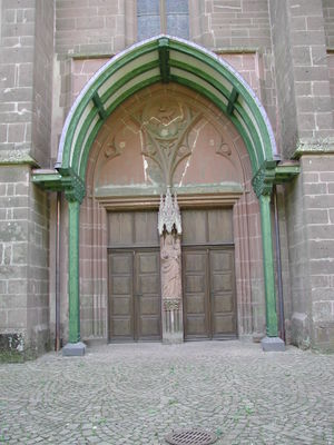 Baldachin krabbelt. | Baldachin krabbelt. Da die Figur mit dem Trumeaupfeiler eine Einheit bildet, kann man annehmen, dass die Madonna zur Bauzeit für dieses Portal geschaffen wurde und seither immer dort stand. | ||
